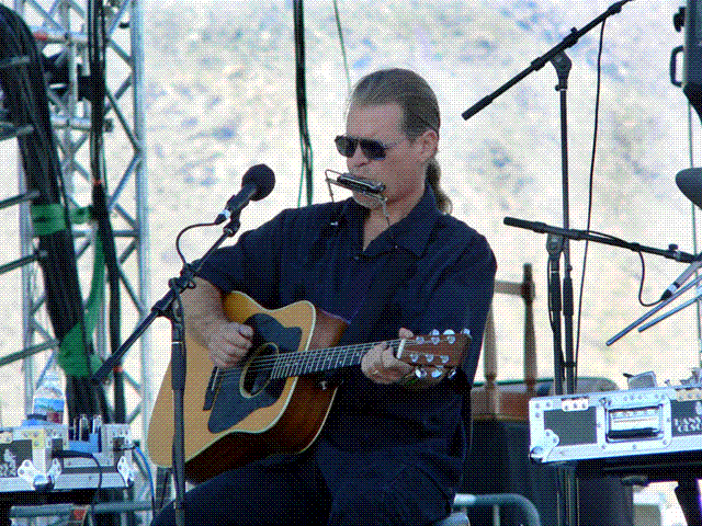 He plays an amplified acoustic guitar and harmonica. He is known as one of the best "harp-in-a-rack" players in the world.